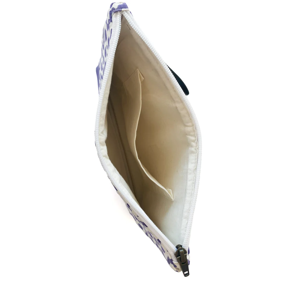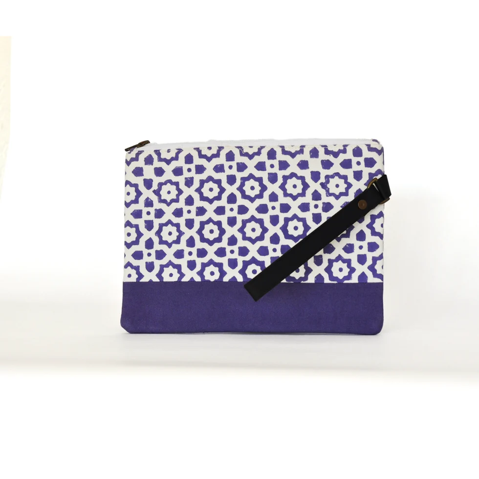 Pochette artigianale in cotone viola con motivi indiani e manico pratico in ecopelle.