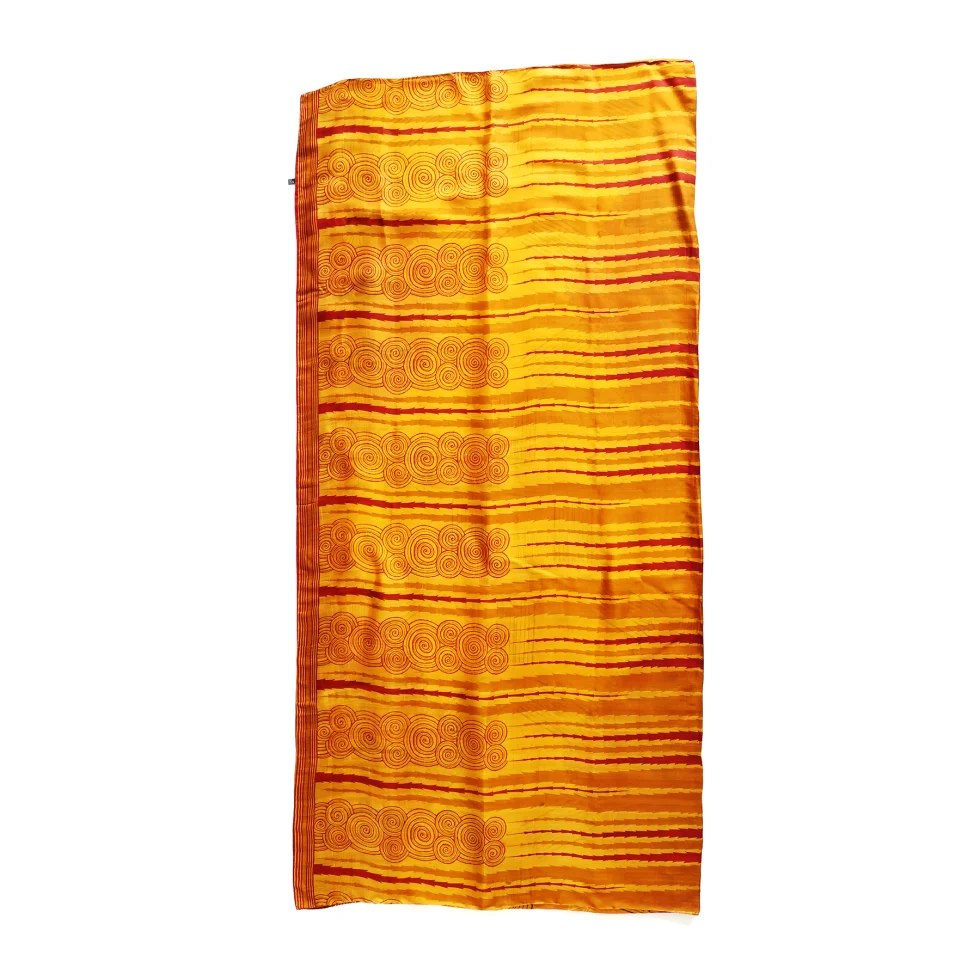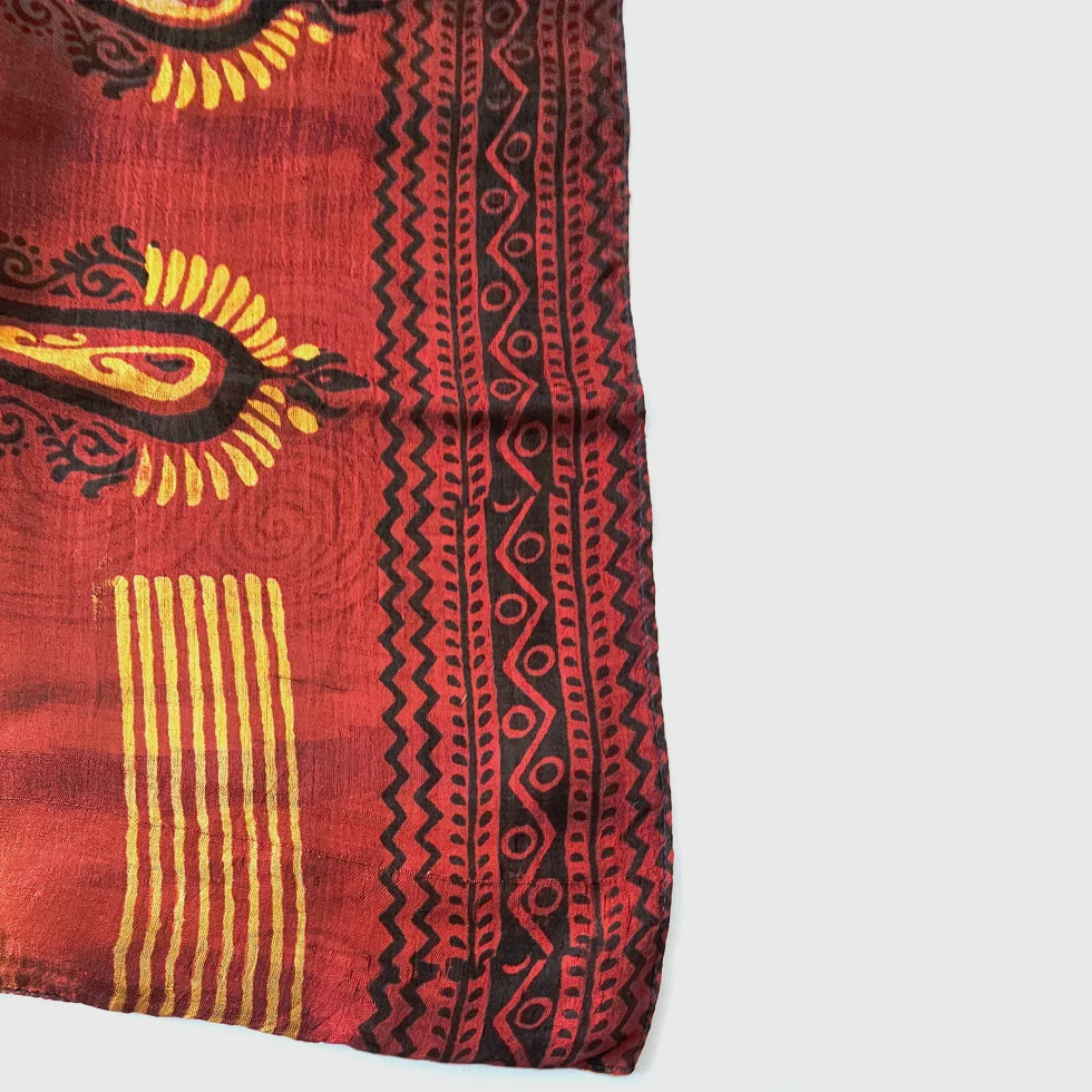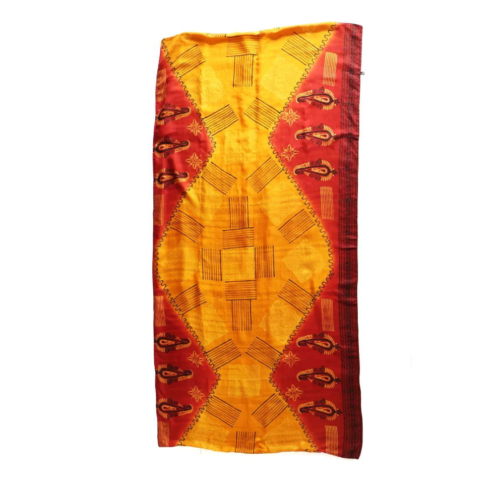 Sciarpa di seta artigianale con motivi indiani in giallo e rosso, elegante e leggera.