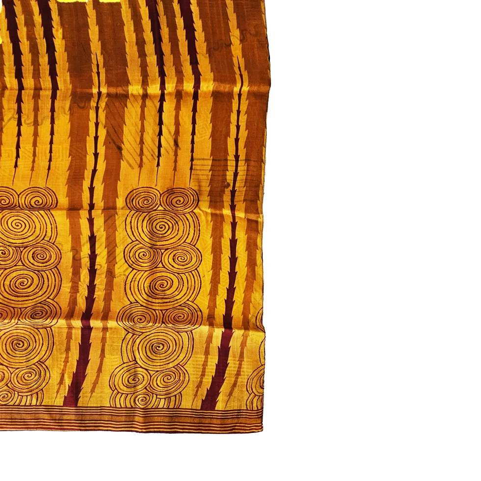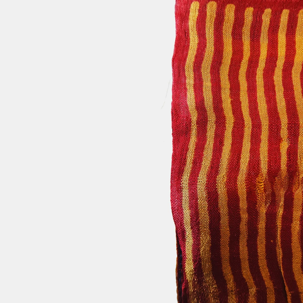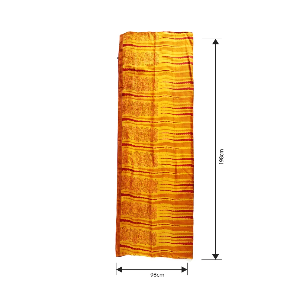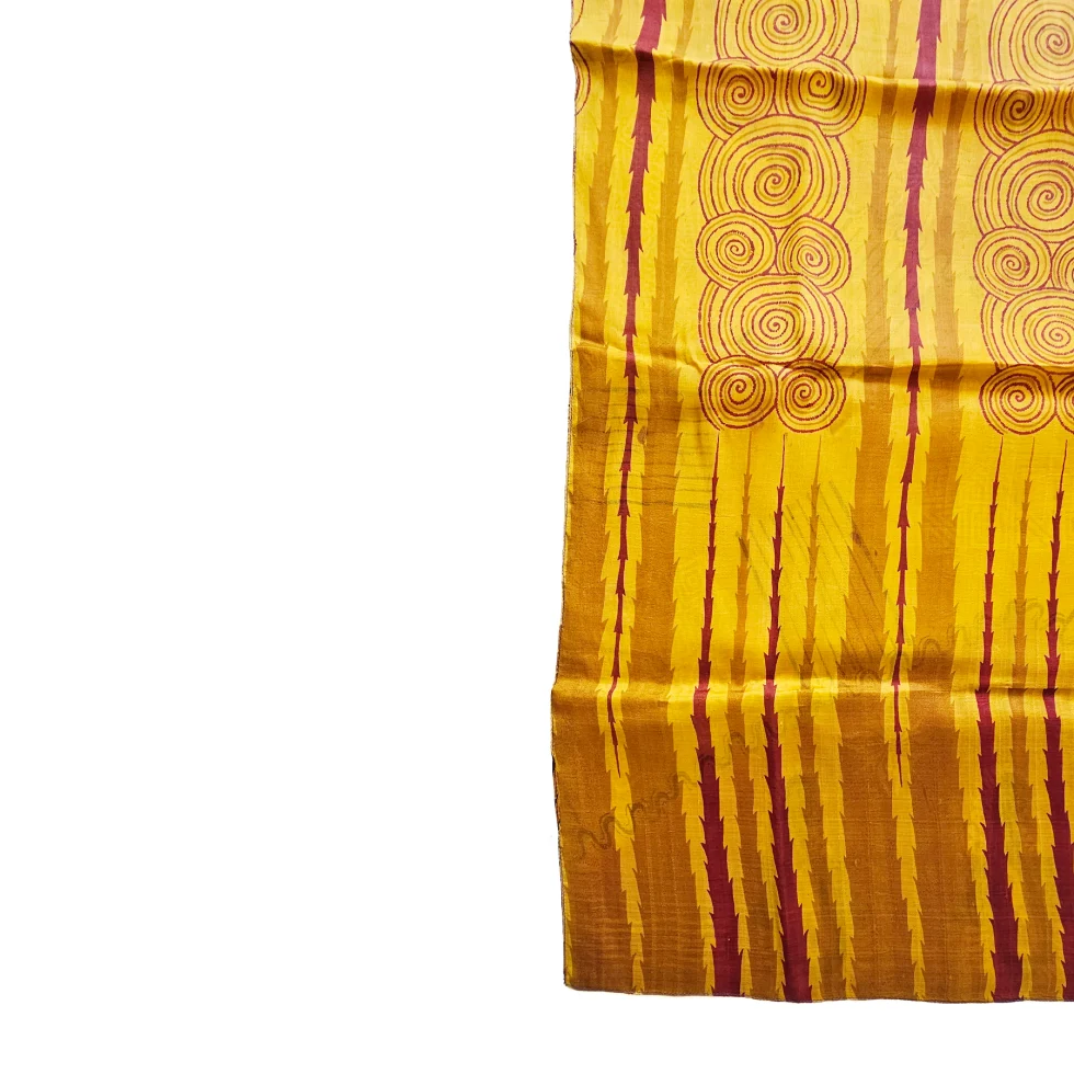 Sciarpa di seta artigianale con motivi indiani in giallo e rosso, elegante e leggera.
