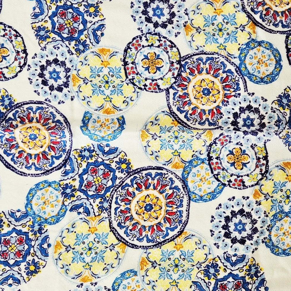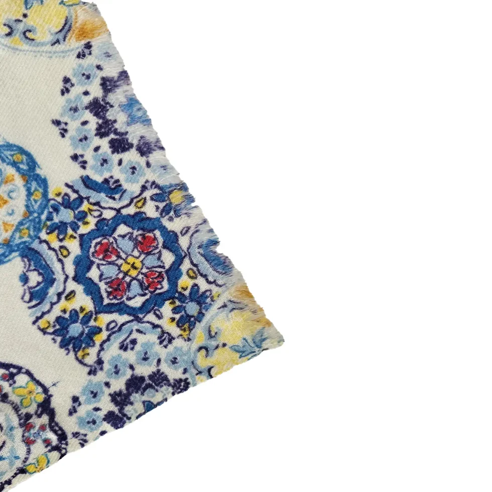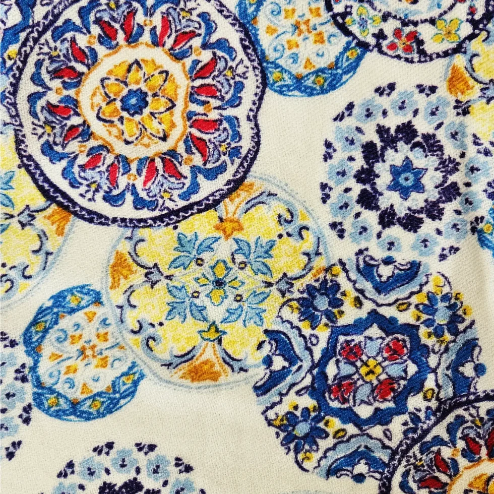 Sciarpa in cashmere 100% con stampa Mandala dai colori vivaci. Realizzata a mano, leggera e calda, perfetta per dare un tocco boho-chic al tuo outfit.