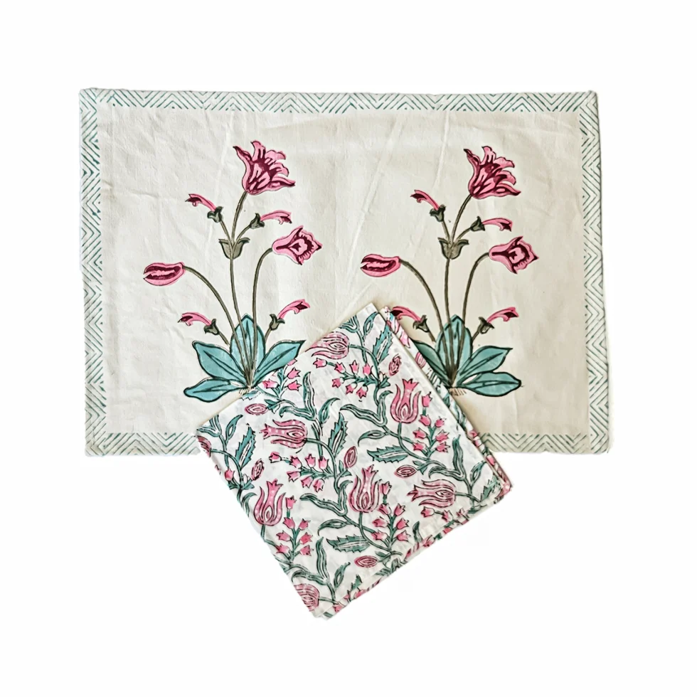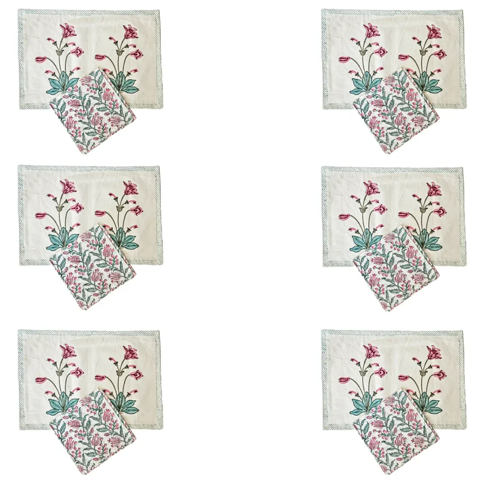 Il set di tovagliette e tovaglioli è composto da sei elementi, realizzati in cotone spesso con motivi floreali stampati artigianalmente. Il set è perfetto per arricchire la tavola quando ci sono ospiti o da usare come sottopiatto. l set di tovagliette e tovaglioli in cotone con motivi floreali è il componente perfetto per arricchire la tua tavola quando ci sono ospiti. Realizzato in cotone spesso e resistente, con stampa Block print di alta qualità, questo set è ideale per le occasioni speciali. Le tovagliette sono di dimensioni 50×35 cm, mentre i tovaglioli sono di dimensioni 44×44 cm. Il set è disponibile in diverse varianti di colore per adattarsi a qualsiasi stile di arredamento.