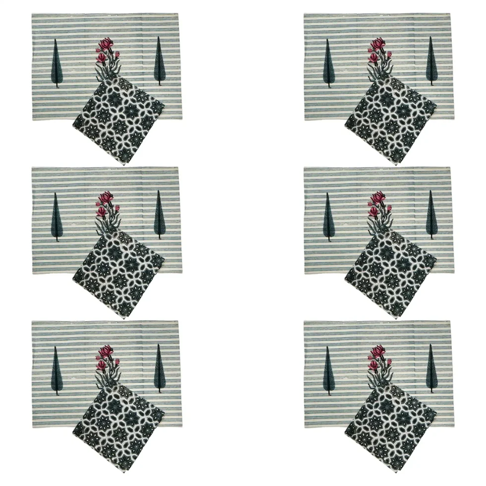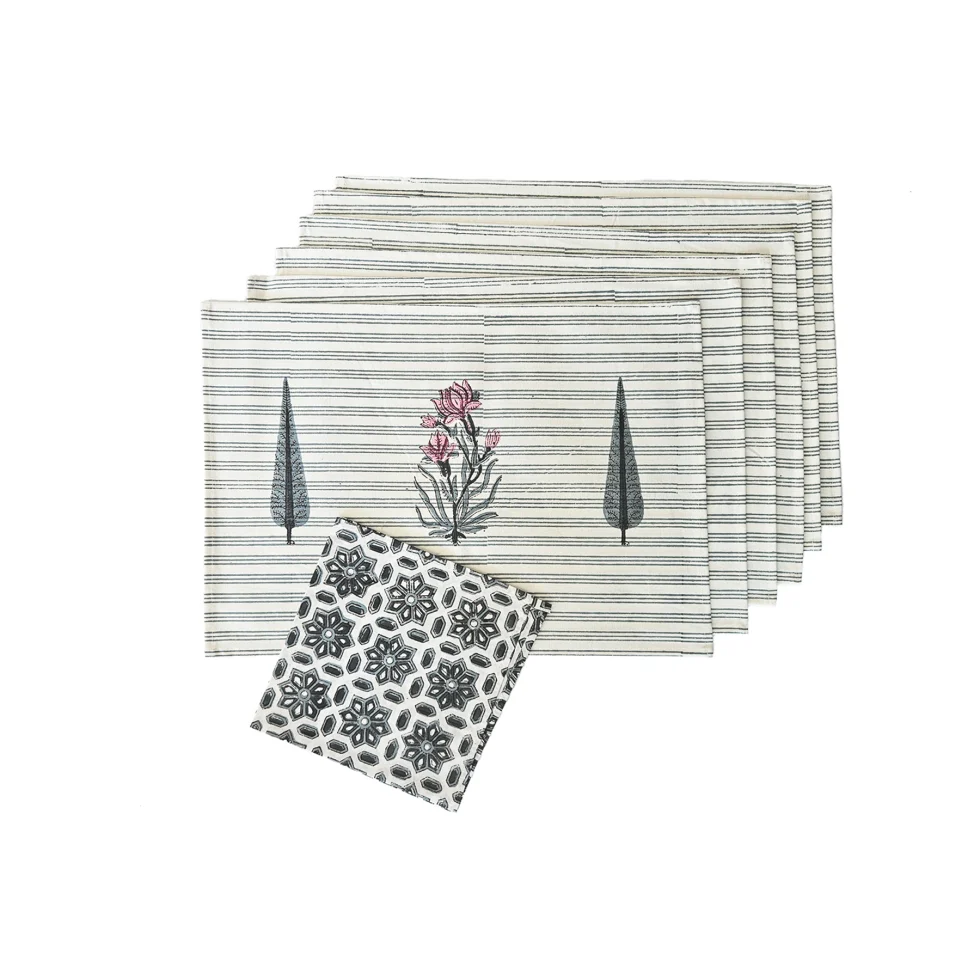Il set di tovagliette e tovaglioli è composto da sei elementi, realizzati in cotone spesso con motivi floreali stampati artigianalmente. Il set è perfetto per arricchire la tavola quando ci sono ospiti o da usare come sottopiatto. l set di tovagliette e tovaglioli in cotone con motivi floreali è il componente perfetto per arricchire la tua tavola quando ci sono ospiti. Realizzato in cotone spesso e resistente, con stampa Block print di alta qualità, questo set è ideale per le occasioni speciali. Le tovagliette sono di dimensioni 50×35 cm, mentre i tovaglioli sono di dimensioni 44×44 cm. Il set è disponibile in diverse varianti di colore per adattarsi a qualsiasi stile di arredamento.