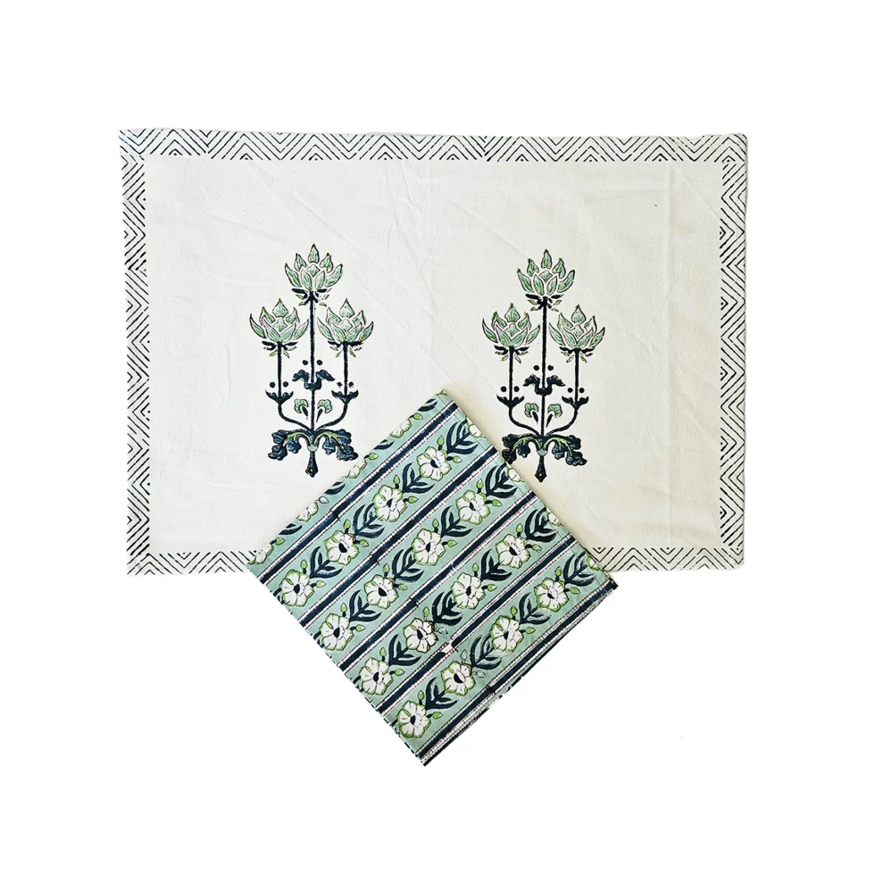 Il set di tovagliette e tovaglioli è composto da sei elementi, realizzati in cotone spesso con motivi floreali stampati artigianalmente. Il set è perfetto per arricchire la tavola quando ci sono ospiti o da usare come sottopiatto. l set di tovagliette e tovaglioli in cotone con motivi floreali è il componente perfetto per arricchire la tua tavola quando ci sono ospiti. Realizzato in cotone spesso e resistente, con stampa Block print di alta qualità, questo set è ideale per le occasioni speciali. Le tovagliette sono di dimensioni 50×35 cm, mentre i tovaglioli sono di dimensioni 44×44 cm. Il set è disponibile in diverse varianti di colore per adattarsi a qualsiasi stile di arredamento.