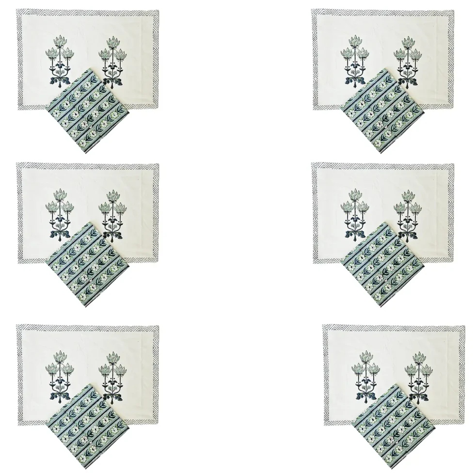 Set 6 tovagliette e tovaglioli in cotone con motivi floreali verdi acqua