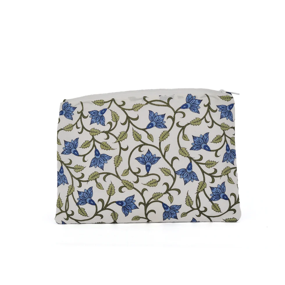 Pochette porta oggetti in cotone con motivi indiani blu e bianchi. Comoda e versatile, misura 28×20 cm.