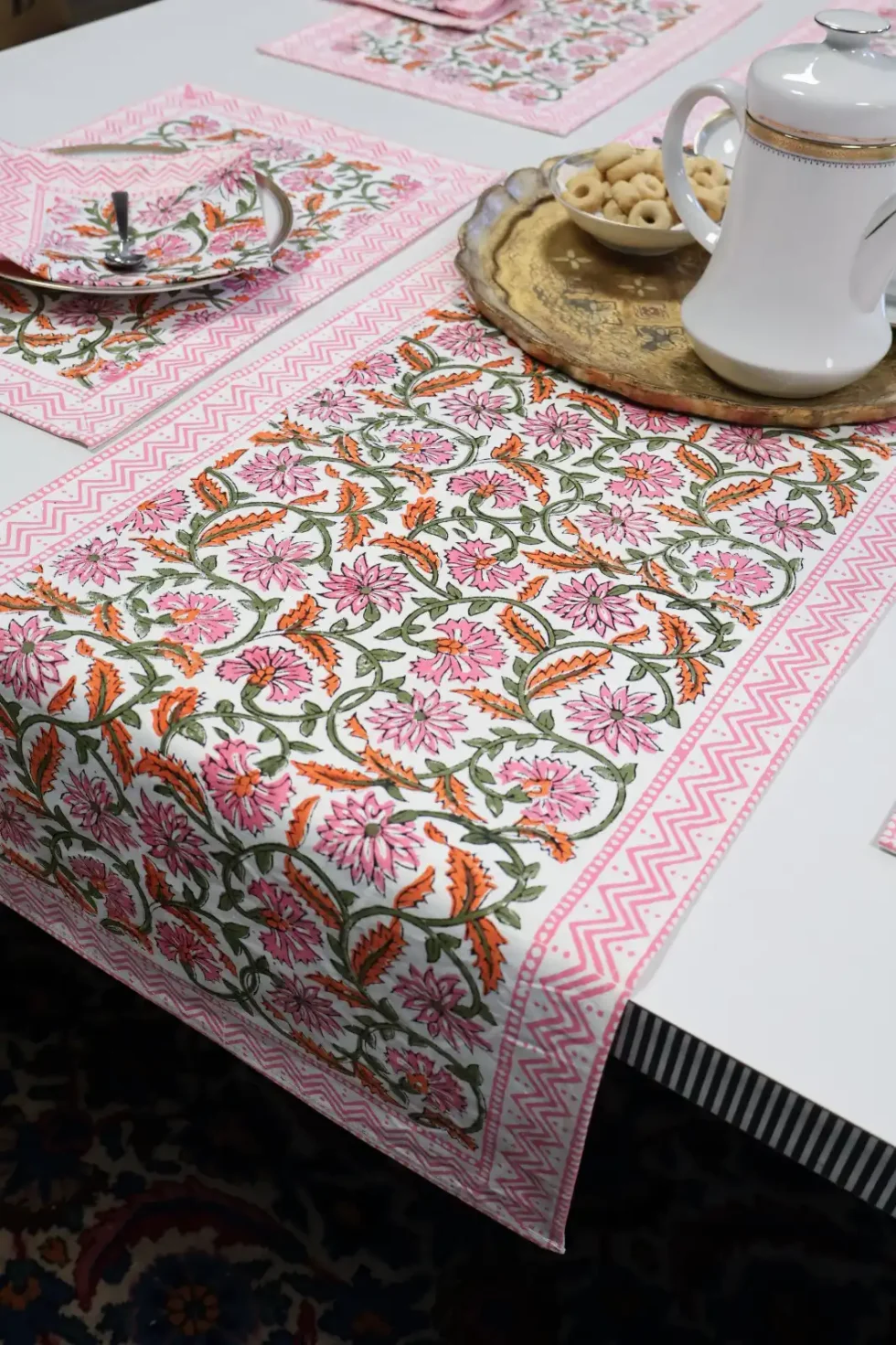 Immagina un tocco di primavera perenne che sboccia sulla tua sala da pranzo. Il nostro runner da tavola “Rekha” non è un semplice accessorio tessile, ma un’emozione che si propaga attraverso i delicati petali impressi con l’antica arte del block print indiano.